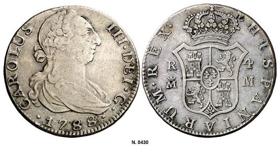 "1788. Carlos III. Madrid. M. 4 reales. Escasa. MBC-/MBC. (Charles III, 1759-88, four reales of 1788, Madrid mint. Scarce, about very fine.)"