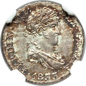This specimen was lot 34480 in Heritage sale 3042 (Long Beach, September 2015), where it sold for $352.50. The catalog description[1] noted, "Ferdinand VII 1/2 Real 1833 M-JI MS65 NGC, Madrid mint, Gem Uncirculated with rich old patina, a razor sharp strike and full mint luster. Likely the finest specimen extant of this scarcer assayer initials combination for this final date of the type, and very desirable as such." This type was struck 1815-33 (Madrid), 1825-33 (Seville) and 1814 (Cadiz). Assayer AJ is more common than JI.