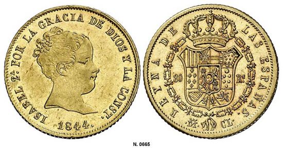 "1844. Isabel II. Madrid. CL. 80 reales. Leves marquitas. Bella. Brillo original. Rara así. EBC/EBC+. (Isabel II, 1833-68, eighty reales of 1844, Madrid mint. Light marks, handsome, lustrous, extremely fine or better, rare thus.)"