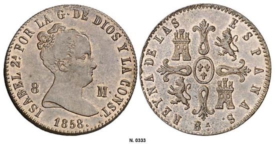Isabel II (1833-1868). 1858. Barcelona. 8 maravedís. Parte de brillo original. Muy bella. Escasa. EBC+. (Isabel II, 1833-68, eight maravedis of 1858, Barcelona mint. Some mint luster, very handsome, choice extremely fine.)