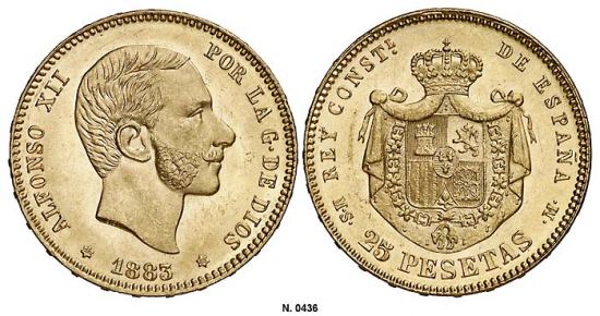 "Alfonso XII (1874-1885). 1883/2*1883. MSM. 25 pesetas. Rectificación de fecha muy clara. Bella. Brillo original. Rara y más así. S/C-. (Twenty-five pesetas of 1883, very clear overdate, nice, about uncirculated.)"