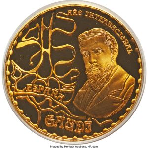 This specimen was lot 35088 in Heritage sale 3067 (Long Beach, September 2018), where it sold for $1,080. The catalog description[1] noted, "Spain: Republic gold Proof "Casa Batllo" 400 Euro 2002-(M) PR69 Deep Cameo PCGS, Madrid mint. A shiny piece and certified as the 34th struck of the issue." Architect Antonio Gaudí designed many buildings in Barcelona which are today beloved monuments of civic pride. This NCLT was part of a series extending 2002-17, honoring Spanish art and history. It was accompanied by a silver 50 euro and a silver 10 euro. Wikipedia comments,