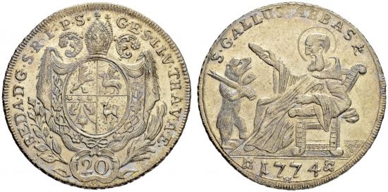 "SWITZERLAND | St. Gallen | St. Gallen, Abtei. Beda Angehrn von Hagenwil, 1767-1796. 20 Kreuzer 1774, Münzstätte des Klosters. Mzz. H auf Rückseite. Laubrand. Sehr selten in dieser Erhaltung. Fast FDC. (abbey of St. Gall, Beda Angehrn von Hagenwil, 1767-96, twenty kreuzer of 1774, mintmark "H" on the reverse. struck within the abbey. Very rare in this condition, About uncirculated.)"