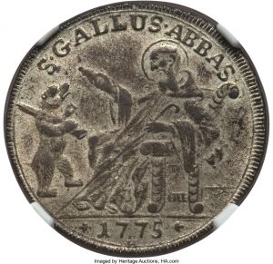 This specimen was lot 34252 in Heritage sale 3049 (Long Beach, September 2016), where it sold for $205.63. The catalog description[1] noted, "St. Gallen. Abbey 10 Kruezer 1775-H AU50 NGC, A bit undergraded, this coin has great luster despite the grade, and excellent details for the type. Worthy of a premium bid. From the Redwood Collection, Part II." This type is noted for 1774-75 and is rather scarce. It is the only ten kreuzer listed for St. Gall in the eighteenth century.