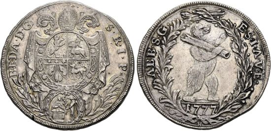 "SCHWEIZ St. Gallen, Beda Angehrn von Hagenwil, 1767-1796. Halbtaler 1777, Münzstätte des Klosters. Mzz. H (für Haag). Dreiblättriger Laubrand. Gutes sehr schön. (Switzerland, canton of St. Gall, Good very fine.)"