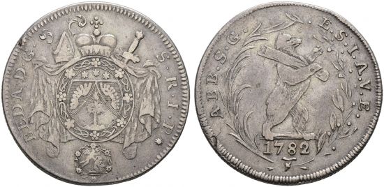 "SWITZERLAND | St. Gallen | St. Gallen, Abtei. Beda Angehrn von Hagenwil, 1767-1796. Halbtaler 1782, Münzstätte des Klosters. Schräg gerippter Rand. Fast sehr schön. Minimale Schrötlingsfehler. (Switzerland, abbey of St. Gall, Beda Angehrn von Hagenwil, 1767-1796, half thaler of 1782, cloister mint. About very fine, Minimal flan flaws.)"