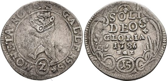 "SCHWEIZ St. Gallen, Stadt und Kanton, 15 Kreuzer 1786, St. Gallen. Fast sehr schön. (Switzerland, city and canton of St. Gall, fifteen kreuzer of 1786, St. Gall mint. About Very Fine.)"