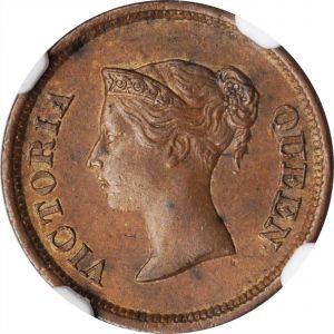 This specimen was lot 72783 in Stack's Bowers Collector's Choice sale (Santa Ana, CA, October 2019), where it did not sell. The catalog description[1] noted, "STRAITS SETTLEMENTS. 1/4 Cent, 1845. Victoria. NGC MS-62 Brown. First year of issue. A well struck example of the type with attractive chocolate brown color and mottled mocha patina." The type was struck in 1845 only while Singapore was a trading station of the East India Company and is scarce in nice condition despite the large mintage. It was converted to bronze for the 1889 issue (KM 14) and struck until 1899.