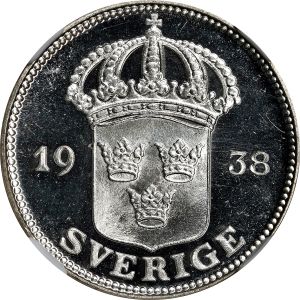 This specimen was lot 73350 in Stack's Bowers Collector's Choice sale (Costa Mesa, CA, May 2023), where it sold for $660. The catalog description[1] noted, "SWEDEN. 50 Ore, 1938. Stockholm Mint. Gustaf V. NGC PROOFLIKE-66 Cameo. A refreshing prooflike example, this wonderful piece displays a cutting cameo effect, and no traces of spotting or haziness." This type is listed for 1911-19 and 1927-39. The early dates are scarce compared to the later dates.