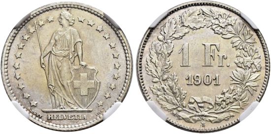 This specimen was lot 5263 in Sincona sale 83 (Zürich, May 2023), where it sold for 900 CHF (about US$1,205 including buyer's fees). The catalog description[1] noted, "SWITZERLAND, 1 Franken 1901 B, Bern. Selten in dieser Erhaltung. NGC MS65. Prachtexemplar. Das neben einem weiteren durch NGC zweithöchstbewertete Exemplar (Rare in this condition, Cabinet piece, Tied with one other for second finest certified by NGC)." This type was struck 1878-1967 in this alloy at the Bern mint. This is not a rare date but later dates from after World War Two are available for a few dollars in any grade.