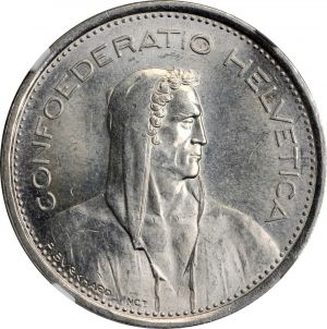 This specimen was lot 23650 in Stack's Bowers ANA sale (Las Vegas, August 2020), where it sold for $50. The catalog description[1] noted, "SWITZERLAND. 5 Francs, 1967-B. NGC MS-63. Type II Variety. A well struck coin with full cartwheel luster. The single finest graded of this edge variety at NGC." This type was struck at the Bern mint 1931-40, 1948-54, 1965-69. The design is still in use today tho the coin is now copper-nickel. Many of the dates from the twentieth century are very common. Edge varieties exist for this date, some quite scarce, but they are completely invisible in the obverse and reverse photos shown here. Prior to confederation in 1850, each Swiss canton issued its own coins.
