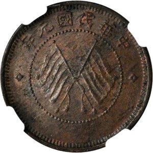 The specimen shown was lot 21738 in the Ponterio sale 165 (Hong Kong, April 2012), where it sold for US$4,780. The catalog description[1] noted, "CHINA. Szechuan. 5 Cash, Year 1 (1912). NGC AU-55 BN. 中華民國元年五文。 醒獅圖。 Ex: Wa She Wong Collection. Ponterio & Associates, Dec. 2010, Lot #313, where it hammered at $4,750."