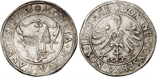 Davenport lists this rare type for 1542-57. A double thaler (Dav-9909) also exists. Thann, in upper Alsace near Strasbourg, was then in the Empire but has been part of France since the late 1600's.