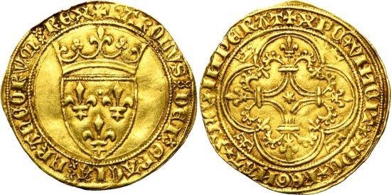 "TOURNAI, atelier royal français, Charles VI (1380-1422), AV écu d'or à la couronne, 3e émission (septembre 1389), point 16e (plein). D/ Ecu de France couronné. R/ Croix fleurdelisée et feuillue, une étoile à six rayons au centre, dans un quadrilobe cantonné de quatre couronnes. Très Beau. Provient du trésor de Bazas, Angoulême, 29 octobre 2005, 9. (lordship of Tournai, French royal mint, Charles VI, 1380-1422, gold écu of the crown, third emission of September 1389, 16th point. Obverse: crowned arms of France; reverse: floriate and leafed cross, a star with six rays at the center, within a quadrilobe cantonned with four crowns. Very fine.)"