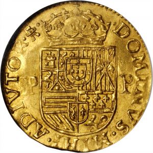 This specimen was lot 3402 in Stack's Bowers NYINC sale (New York, January 2017), where it sold for $5,405. The catalog description[1] noted, "SPANISH NETHERLANDS. Tournai. Couronne d'Or, 1589. Philip II (1555-98). NGC MS-62. RARE. Floriate cross, lions and briquets in angles; Reverse: Crowned arms between "P - P", Portuguese arms superimposed. Housed in an older generation NGC holder, the sole finest certified example, possibly the finest extant. A tremendous piece with fantastic strike detail on the arms and an abundance of luster. Great eye appeal." This is the second of two types for Tournai; the first, issued 1584-87, lacked the arms of Portugal shown here. The couronne d'or was revived in Tournai in 1614 but we don't know if the same weight standard was used.