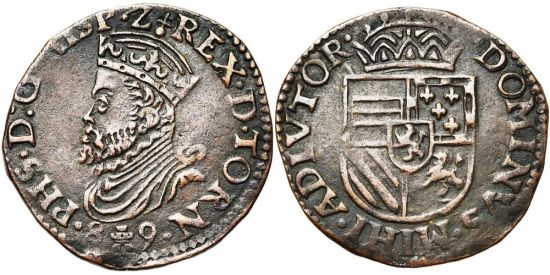 "TOURNAI, Seigneurie, Philippe II (1555-1598), Cu liard, 1589. D/ B. couronné à g. R/ Ecu couronné. Rare. Très Beau. (lordship of Tournai, Philip II, 1555-98, copper liard of 1589. Obverse: crowned bust left; reverse: crowned arms. Rare, Very Fine.)"