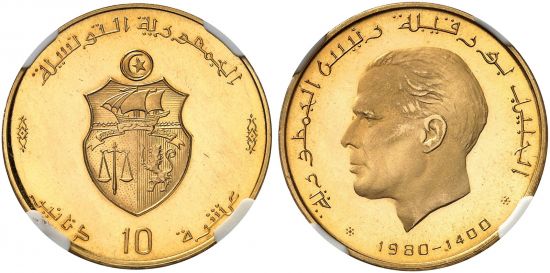"Republik, seit 1957. 10 Dinars AH 1400 (1980). Habib Bourguiba. KM - (dieser Jahrgang fehlt). Fr-vgl. 17 (dieser Jahrgang fehlt). NGC PF64 Ultra Cameo. (republic of Tunisia, since 1957, ten dinars of AH 1400, Habib Bourgiba. Missing in KM, missing in Freidberg, choice proof.)"