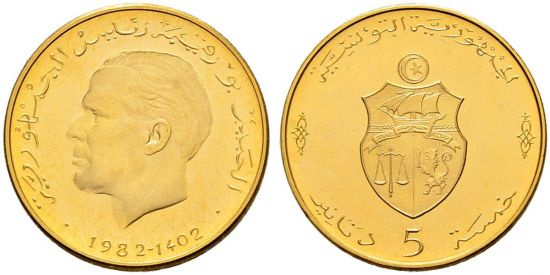 This specimen was lot 358 in Sincona sale 31 (Zürich, October 2016), where it sold for 900 CHF (about US$1,068 including buyer's fees). The catalog description[1] noted, "REPUBLIC OF TUNISIA, 5 dinars 1982ce/1402ah AU Arabic legend Fdc." This type was struck in small numbers 1967-82 with Arabic and French legends (KM 325a). It is unlikely to have circulated beyond the president's circle of cronies and supporters. It is rare but inexpensive because of low demand.