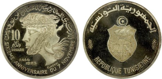 This specimen was lot 1486 in Stephen Album sale 47 (Santa Rosa, CA, September 2023), where it sold for $390. The catalog description[1] noted, "TUNISIA: Republic, AR 10 dinars, 1993/AH1414, 6th Anniversary of Revolution, mishandled (hairlined) as usual, lightly toned, mintage of only 1000 pieces, Proof, RR, ex Wolfgang Schuster Collection." Other ten dinars for 1993 include KM 340 (gold, French legends) and KM 341 (gold, Arabic legends).