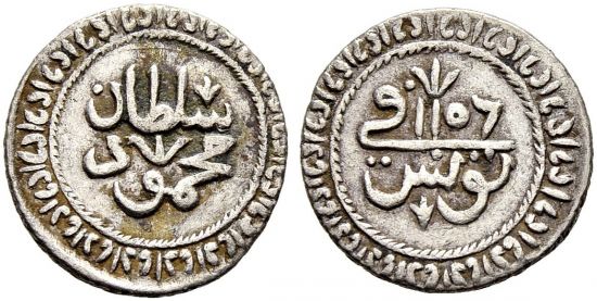 This specimen was lot 25 in Sincona sale 31 (Zürich, October 2016), where it sold for 250 CHF (about US$297 including buyer's fees). The catalog description[1] noted, "OTTOMAN TUNIS | Mahmud I (1143-1171/1730-1754ce) 2 kharub 1156ah (1743ce) Bi, rare date vf." This type was struck AH 1153-1156 in the name of Mahmud I in Constantinople. It is very rare in nice condition. Sixteen kharub made a piastre or riyal, the largest silver coin issued in Tunisia in the eighteenth century.