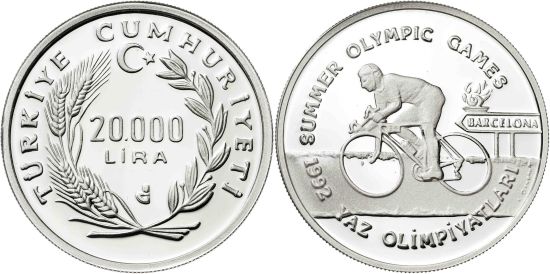 This specimen was lot 3488 in Aureo y Calicó sale 422 (Barcelona, December 2023), where it sold for 22 € (about US$29 including buyer's fees). The catalog description[1] noted, "Turquía. 1992. 20000 liras. Juegos Olímpicos - Barcelona '92. Ciclismo. En estuche. AG. Proof." In 1970, US$1 = 11.3 lira; in 1990, US$1 = 2,500 lira; in 1995, US$1 = 43,000 lira. The SCWC notes that this Olympic NCLT was struck in 1990. This may be the case, as this denomination was not used after 1990, but the coin is dated 1992 so that is how we will file it. It was accompanied by KM 1077, which featured speed skating. Wikipedia comments, "Turkey, then the Ottoman Empire, first participated at the Olympic Games in 1908 and has sent athletes to compete in most editions of the Summer Olympic Games since then.... Turkey has also participated in most Winter Olympic Games since their first appearance in 1936. Turkish athletes have won a total of 103 medals, divided into 41 golds, 26 silvers and 36 bronzes. Turkey won the most medals in wrestling."