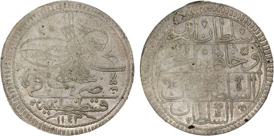 This specimen was lot 1805 in Steve Album Auction 52 (Santa Rosa, CA, May 2025), where it sold for $72. The catalog description[1] noted, "TURKEY: Mahmud I, 1730-1754, AR kurush, Kostantiniye, AH1143 (1730), initial #29, lightly lustrous, XF-AU." During Mahmud's reign, mint officals did not use regnal years, so the coinage can only be dated to the accession year, AH 1143. The kuruş was forty paras. The regime's financial incompetence meant that the kuruş was never stable; it would shrink to the size of a half dime by 1839. The main difference btween this issue and the very similar KM 210 is the weight; KM 210 being over 24 g, KM 211 being less. Since this can't be told from auction photos, one must look at the details of the florals surrounding the rosette to the right of the toughra.