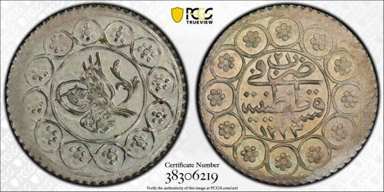 This specimen was lot 2345 in Stephen Album sale 37 (Santa Rosa, CA, June 2020), where it sold for $65.45. The catalog description[1] noted, "TURKEY: Mahmud II, 1808-1839, AR 20 para, Kostantiniye, AH1223 year 21, PCGS graded MS62." This type was struck years 21-22. Debasement was continuous throughout the sultan's reign and coinage types were usually shortlived. Regnal year 21 (AH 1243) corresponded to July 1827-July 1828.