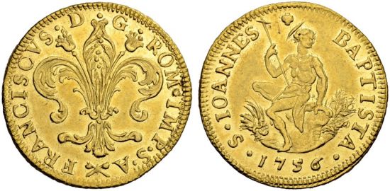 "ITALY, Florence, Francesco II. di Lorena, 1737-1765. Ruspone 1756, Florenz. Vorzüglich. (grand duchy of Tuscany, Francis II of Lorraine, 1737-65, ruspone of 1756, Florence mint. Extremely fine.)"