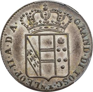 This specimen was lot 75782 in Stack's Bowers Collectors Choice Online Auction (Costa Mesa, CA, February 2025), where it sold for $105. The catalog description[1] noted, "ITALY. Tuscany. 5 Quattrini, 1830. Florence Mint. Leopoldo II. PCGS AU-58." This type is listed for 1826-30. Montenegro gives its composition as copper but this specimen appears to be billon. These obscure little Italian states coins don't catalog for much but are very difficult to find. Altho the 1829 has a higher mintage, this appears to be the commonest date. Leopold, a junior Hapsburg prince, ruled Tuscany until it was incorporated into the united kingdom of Italy in 1859-60.
