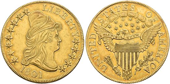 "Vereinigte Staaten. 10 Dollars 1801, Philadelphia. Liberty Cap type. Selten. Vorzüglich-FDC. NGC MS61. Feine Goldpatina. (United States, ten dollars of 1801, Philadelphia mint, liberty cap type. Rare, Extremely fine-uncirculated, Nice gold toning.)"