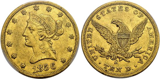 "USA, 10 Dollars 1856 S, San Francisco. Liberty head type. No motto. PCGS AU53."