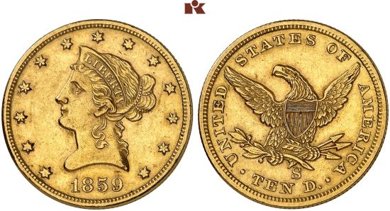 "VEREINIGTE STAATEN VON AMERIKA / USA, 10 Dollars 1859, S, San Francisco. Liberty. 15,05 g Feingold. In US-Plastikholder der NGC mit der Bewertung AU 55 (6862348-001). GOLD. R Fast vorzüglich. (United States of America, ten dollars of 1859, San Francisco mint, liberty head. Graded NGC AU-55, rare, about extremely fine.)"