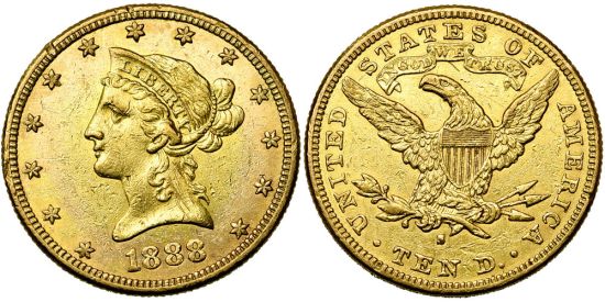 "ETATS-UNIS, AV 10 dollars, 1888 S. Fines griffes. Petits coups. Très Beau à Superbe. (United States, gold ten dollars of 1888, San Francisco mint. Fine scratches, minor nicks, Very Fine - Extremely Fine.)"