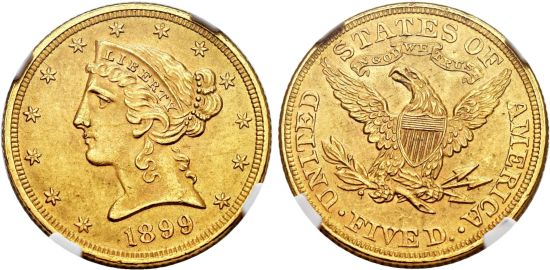 This specimen was lot 2396 in SINCONA Auction 97 (Zürich, May 2025), where it sold for 750 CHF (about US$1,088 including buyers' fees). The catalog description[1] noted, "USA, 5 Dollars 1899, Philadelphia. Liberty head type. NGC MS64." The coronet head half eagle was struck 1839-1907 with the "IN GOD WE TRUST" motto added in 1866. Philadelphia participated in production nearly every year with most of its issues being common.