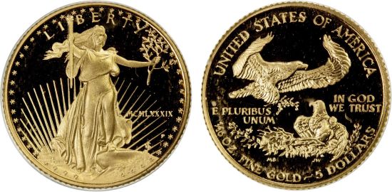 This specimen was lot 2502 in Stephen Album sale 43 (Santa Rosa, CA, May 2022), where it did not sell. The catalog description[1] noted, "UNITED STATES: AV 5 dollars, 1989-P, Brilliant Proof, American Gold Eagle series, 1/10 troy ounce, housed in protective plastic capsule." A commemorative gold five dollars was issued in 1989 for the bicentennial of Congress (KM 226) but only from the West Point mint. The gold tenth ounce, introduced in 1986, is still in production. The uncirculated strikes do not bear the "P" mintmark, which was dropped after 1993.