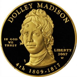 This specimen was lot 12734 in Stack's Bowers October 2018 auction, where it sold for $600. The lot description noted, "2007-W First Spouse Gold Bullion Coin. Dolley Madison. Proof-69 Deep Cameo (PCGS)." The mint inaugurated the presidential dollar series in 2007. To honor the presidential spouses, half ounce gold coins were issued featuring them up to Nancy Reagan. Dolley Madison is featured here, saving state papers and the Gilbert Stuart portrait of Washington from invading British soldiers.