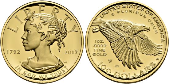 "Vereinegte Staaten. 100 Dollars 2017. American Liberty - 225 Jahres United States Mint. Polierte Platte. Im Originaletui. (United States, one hundred dollars of 2017, American Liberty series, 225th anniversary of the mint. Choice Proof, In original box.)"