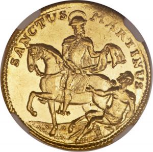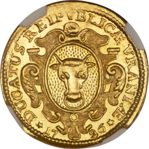 This specimen was lot 22783 in Heritage sale 3021 (New York, January 2013), where it sold for $2,585. The catalog description[1] noted, "Uri. Gold Ducat 1736/20, MS63 NGC, prooflike mint luster, highly attractive, noted by NGC as struck over Fr-406. Very scarce type in mint state." Unlike the extensive coinage of Basel, Bern or Zürich, the forest canton of Uri issued only a few, rare ducats such as this one with a cow's head.