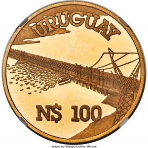 This specimen was lot 31197 in Heritage auction 3096 (Dallas, TX, March 2021), where it sold for $1,680. The catalog description[1] noted, "Uruguay: Republic gold Proof Pattern "Hydroelectric Dam" 100 Nuevos Pesos 1981-So PR62 Ultra Cameo NGC, Santiago mint. Featuring a hydroelectric dam amidst watery fields, this scarce gold commemorative issue exhibits an attractive yet hairlined surface. From the Paramount Collection." This is a pattern version of KM 80 (12 g, 0.900 fine silver, m. 25,000). The gold version actually produced and sold was denominated N$5,000 (KM 81).