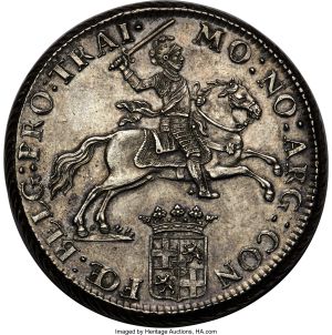 This specimen was lot 34067 in Heritage sale 3106 (New York, January 2023), where it sold for $6,300. The catalog description[1] noted, "Netherlands: Utrecht. Provincial silver Double Ducaton (2 Silver Rider) 1774 MS61 NGC. Oblique milling left. An extremely rare date for this double-weight type. Exemplary strike, seemingly cleaned and now retoned in dove gray, pleasantly devoid of the expected hairlines that normally accompany the designation." Single ducatons were struck in this style 1739-94. Double ducatons aren't listed in the SCWC but are well attested for many dates.