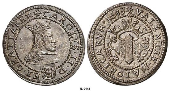 "A principios del reinado de Carlos II se intentó la modernización del taller monetario de Valencia introduciendo el molino de acuñación. Esta innovación chocó con los hábitos de los operarios de la ceca, acostumbrados a producir grandes cantidades pero en fabricaciones mucho menos cuidadas y con grabados estereotipados. La pugna entre los impulsores de la reforma y los 'tradicionalistas' duró dos o tres años, a lo largo de los cuales las fabricaciones a molinillo no pasaron de la fase de pruebas; finalmente se hubo de abandonar el intento y seguir con la acuñación a martillo, que perduró hasta finales del reinado y todavía en las emisiones del pretendiente Carlos III. Por todo lo dicho, las piezas valencianas de molinillo son extremadamente raras y nos han llegado sólo unos pocos ejemplares de cada una de las fechas. Más excepcional es la rareza de este bello doble real: es la primera vez que lo hemos visto y sólo conocemos otro ejemplar, el publicado en el catálogo Calicó. (At the beginning of the reign of Charles II, it was decided to modernize the mint of Valencia by introducing milled coinage. The innovation shocked the locals and the mint workers, who were used to producing large quantities of poorly struck, carelessly engraved coins. The struggle between the reformers and the traditionalists lasted two or three years, during which milled coinage never passed beyond the pattern stage; finally, the mint reverted to hammered coinage which remained the norm through the reign of Charles II and the pretender Charles III. Because of this, milled coinage from Valencia is extremely rare with only a few known for each date. This date is the first we have seen and we know of only one other, the plate coin in the Calicó catalog.)"