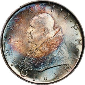 This specimen was lot 75305 in Stack's Bowers Collector's Choice sale (Costa Mesa, CA, February 2024), where it sold for $125. The catalog description[1] noted, "ITALY. Papal (Vatican City). 500 Lire, 1959. Pope John XXIII. PCGS MS-66. This coin displays a stunning array of bold color - cobalt, aquamarine, plum and gold. Very attractive." In 1860, the king of Sardinia succeeded in unifying the Italian peninsula after centuries of fragmentation. The Papal States, protected by a French army, were not incorporated until 1870. The pope, denouncing the occupation of his domain, withdrew into the Vatican palace as a self-declared prisoner. Normal relations with the Italian government were not restored until Mussolini signed a concordat in 1929, granting the Pope sovereignty over Vatican City. Coinage began that year, struck at the Rome mint. Coins are issued for the Vatican City in symbolic amounts but as they are eagerly saved as souvenirs by tourists, they are not in short supply for collectors. This type, struck in 1959 for John XXIII, is common. The lira was retired in 1999 when Italy joined the euro.