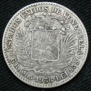 Shown is a 1936 one bolivar, minted in Philadelphia. On the obverse is a portrait of Simon Bolivar, as designed by Albert Barre. The denomination is shown on the reverse as GRAM.5.