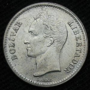 Shown is a 1944 quarter bolivar, minted in Philadelphia. The obverse features the portrait of Simon Bolivar, recognized as liberator of the Venezuelans from rule by the Spanish. The reverse features the coat of arms, and the denomination written as GR.1.250, which is one quarter the weight of a one bolivar coin.