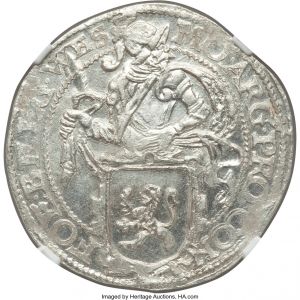 This specimen was lot 34546 in Heritage sale 3082 (New York, January 2020), where it sold for $3,360. The catalog description[1] noted, "Netherlands: West Friesland. Provincial 1/2 Lion Daalder 1644 MS65 NGC." Lion daalders were struck in most of the provinces that today make up the Netherlands. This type is recorded in the SCWC for Westfriesland for 1606-68 with various mintmarks (KM 22.1: 1616-48; KM 22.3: 1629, 1650-68; KM 22.4: 1606-29, 1643, 1650). The province also struck half rijksdaalders until 1662.