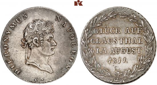 "WESTPHALEN, KÖNIGREICH, Hieronymus Napoleon, 1807-1813. Gulden 1811, C. Ausbeute. Winz. Randfehler, fast vorzüglich. (Germany, kingdom of Westphalia, Jerome Napoleon, 1807-13, gulden of 1811, for the mines. Minor edge defects, about extremely fine.)"