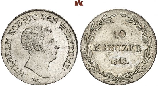 "WÜRTTEMBERG, WÜRTTEMBERG, HERZOGTUM, SEIT 1806 KÖNIGREICH. Wilhelm I. 1816-1864. 10 Kreuzer 1818. Prachtexemplar. Feine Patina, fast Stempelglanz. (Germany, kingdom of Wurttemberg, William I, 1816-64, ten kreuzer of 1818. Cabinet piece, fine patina, about uncirculated.)"