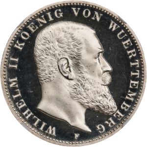 This specimen was lot 32080 in Stack's Bowers NYINC sale (New York, January 2025), where it sold for $2,040. The catalog description[1] noted, "GERMANY. Wurttemberg. 3 Mark, 1908-F. Stuttgart Mint. Wilhelm II. NGC PROOF-65 Ultra Cameo. An alluring proof specimen with razor sharp cameo distinction, the fields giving a sharp deep mirroring and the devices being nicely frosted throughout. An example that certainly does not lack for eye appeal, and therefore a piece for many collectors." This type was struck 1908-14. It superseded the vereinsthaler which had been allowed to circulate after unification. The kingdom was abolished with the collapse of the Empire in 1918.
