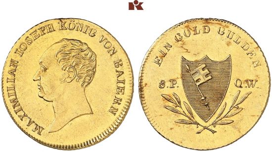 "BAYERN, HERZOGTUM, SEIT 1623 KURFÜRSTENTUM, Maximilian I. (IV.) Joseph, 1799-1806-1825. Goldgulden o. J. Neujahrsgoldgulden. Präsent der Stadt Würzburg. GOLD. Henkelspur, sehr schön-vorzüglich. Die Stadt Würzburg war seit dem 15. Jahrhundert verpflichtet, ihrem jeweiligen Landesherren als Herzog von Franken eine Zahlung von 50 Goldgulden zum Neujahr eines jeden Jahres zu leisten, vermutlich in Ablösung einer alten Naturalabgabe. Auch nachdem Würzburg an Bayern gefallen war, wurde dieser Brauch beibehalten. (Germany, electorate of Bavaria, undated gold gulden, for the New Year, presented by the city of Wurzburg. Mount mark, very fine to extremely fine. Since the 15th century, the city of Würzburg was obliged to make a payment of 50 gold gulden to their suzerains as Duke of Franconia on the New Year of each year, presumably in replacement of an old levy in kind. Even after Würzburg fell to Bavaria, this custom was maintained.)"