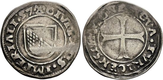 "SCHWEIZ Zürich, Stadt und Kanton, Halbbatzen 1557, Zürich. Stempelschneider Gutenson. Selten. Fast sehr schön. (Switzerland, canton of Zürich, half batzen of 1557, Zürich mint. Rare, About Very Fine.)"